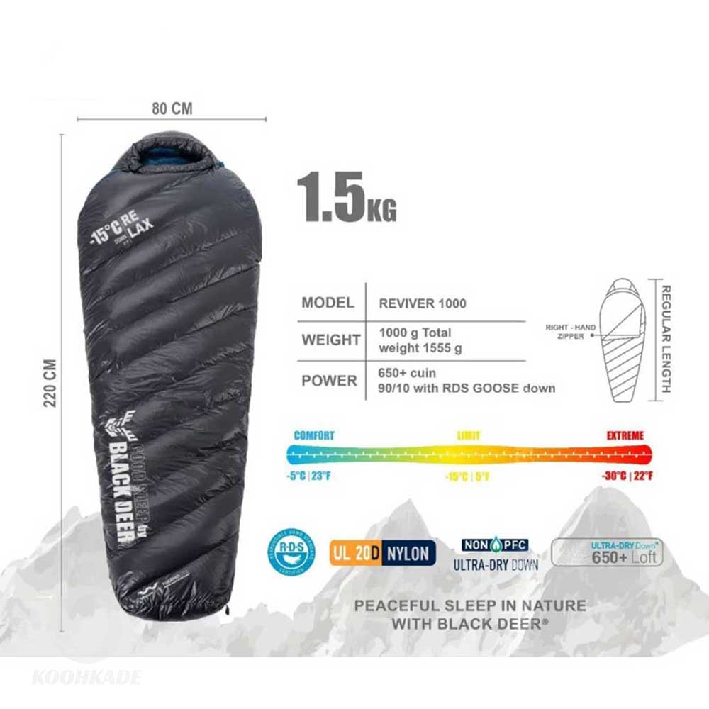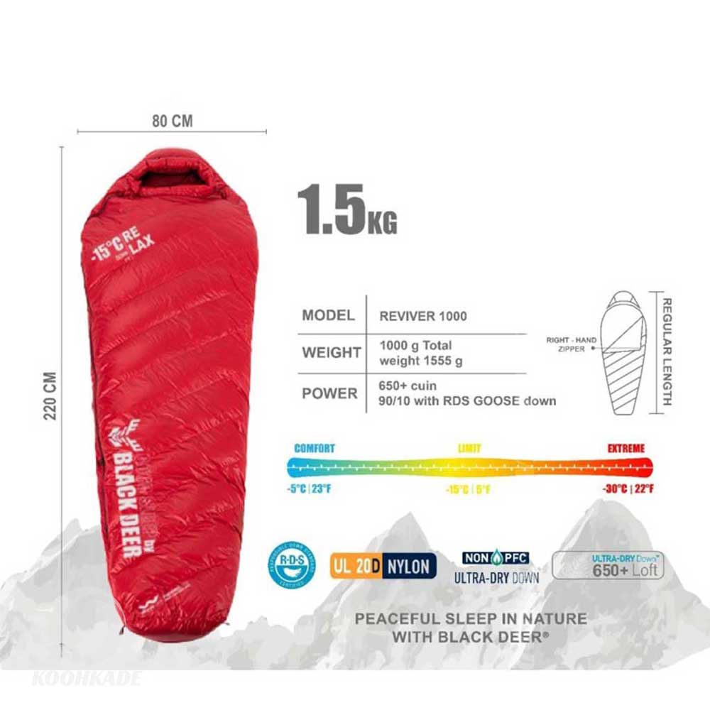 کیسه خواب پر بلک دیر 1000 سری REVIVER , یک همراه فوق العاده در شب های سرد در سفر های ماجراجویی و یا کوهنوردی می باشد. لایه خارجی این کیسه خواب ساخته شده از جنس 400T 20D Nylon ripstop و لایه داخلی آن از جنس 400T 20D Nylon می باشد. کیسه خواب پر بلک دیر مدل REVIVER 1000 یک مدل با کیفیت و خوش ساخت با عایق پر غاز و استاندارد R.D.S است که تراکم بالای 90/10 و فیل پاور 650 آن گویای استفاده از بهترین نوع پر در این کیسه خواب می باشد.