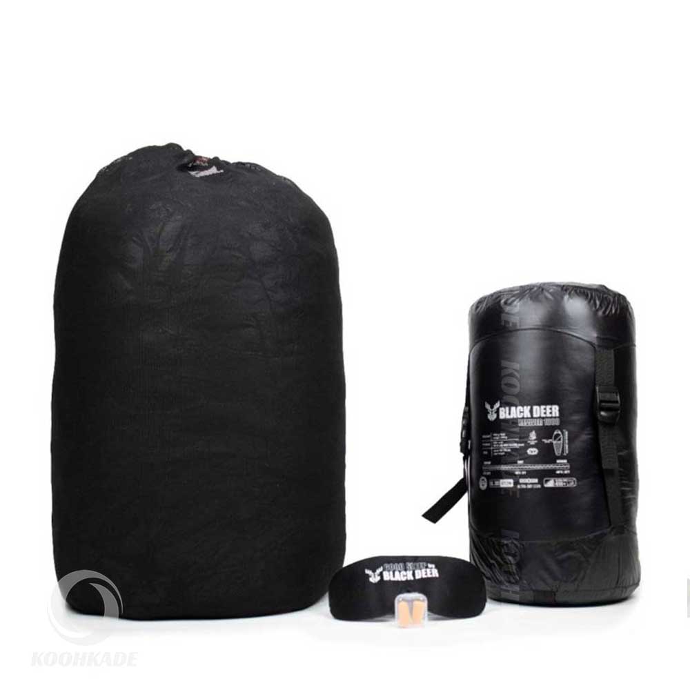 همراه کیسه خواب پر بلک دیر مدل REVIVER 1000 یک عدد چشم بند و گوش گیر وجود دارد که با جلوگیری از برخورد نور از چشم، صدای باد و داخل شدن حشرات به گوش و چشم شما جلوگیری کند. همچنین یک عدد کیسه استراحت توری هم همراه این کیسه خواب وجود دارد تا در مواقعی که از کیسه خواب استفاده نمیکنید، آن از حالت فشرده خارج کرده و در داخل کیسه استراحت قرار دهید تا دچار تراکم پر در یه نقطه نشود.
